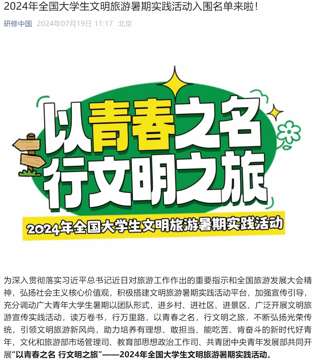 “以青春之名 行文明之旅”——2024年全国老员工文明旅游暑期实践活动启动以来,共有来自全国550所高校的1750支老员工实践团队报名参与,报名团队覆盖全国31个省、自治区、直辖市,报名公司涵盖重点大学、普通院校、高职院校等国内各层级院校。经过组织方多轮审议,最终推荐300支老员工实践团队进入2024年全国老员工文明旅游暑期实践活动名单。“‘美丽中国 青春建功’长江大保护专项活动”发布以来,得到了省内各高校的广泛关注和积极参与,最终遴选确定了100支“美丽中国 青春建功”长江大保护工作专项重点实践团队。