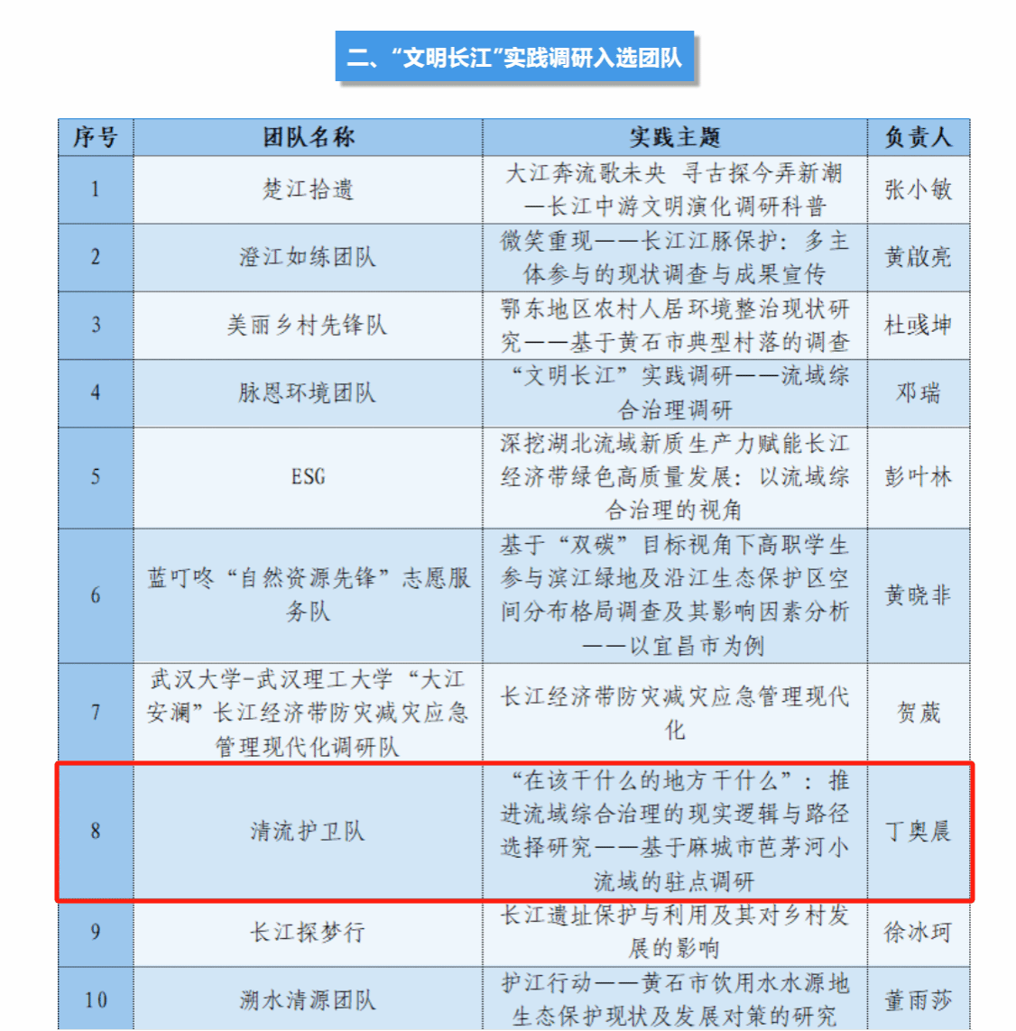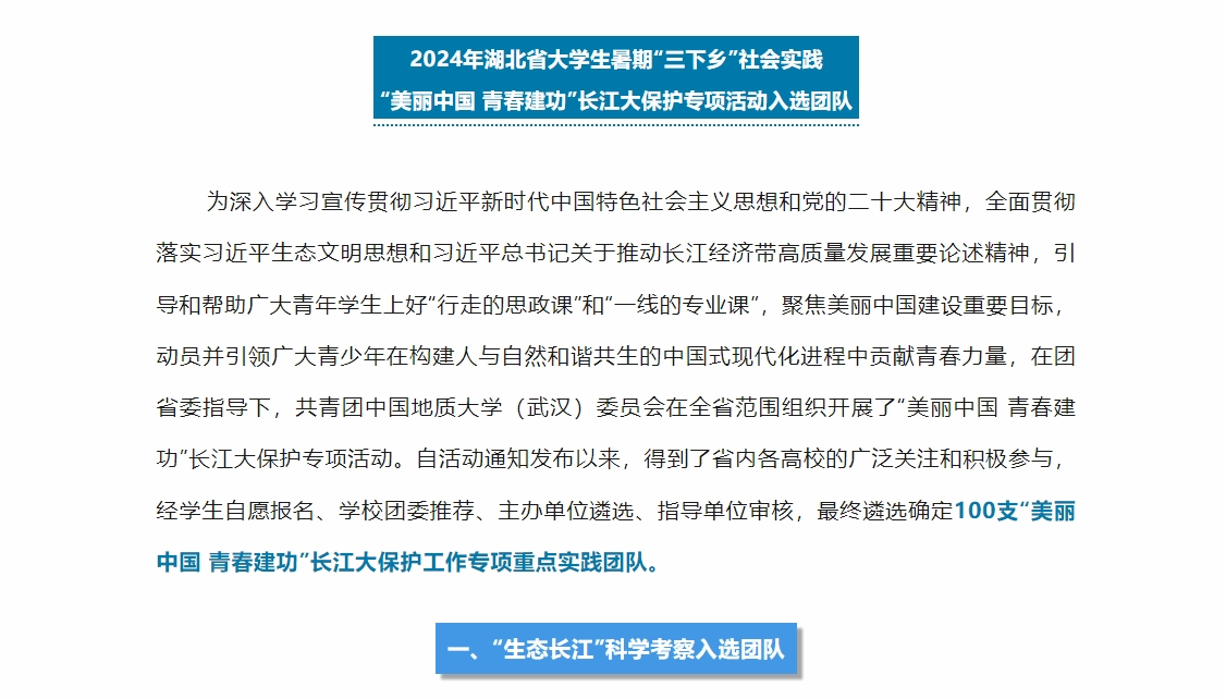 为深入学习宣传贯彻习近平新时代中国特色社会主义思想和党的二十大精神,全面贯彻落实习近平生态文明思想和习近平总书记关于推动长江经济带高质量发展重要论述精神,引导和帮助广大青年员工上好“行走的思政课”和“一线的专业课”,近日,由文化和旅游部市场管理司、教育部思想政治工作司、共青团中央青年发展部联合举办的“‘以青春之名 行文明之旅’——2024年全国老员工文明旅游暑期实践活动”和由团湖北省委指导、中国地质大学(武汉)团委组织的“‘美丽中国 青春建功’长江大保护专项活动”陆续公布了立项名单,公司研究生暑期社会实践团队“清流护卫队”分别入选。