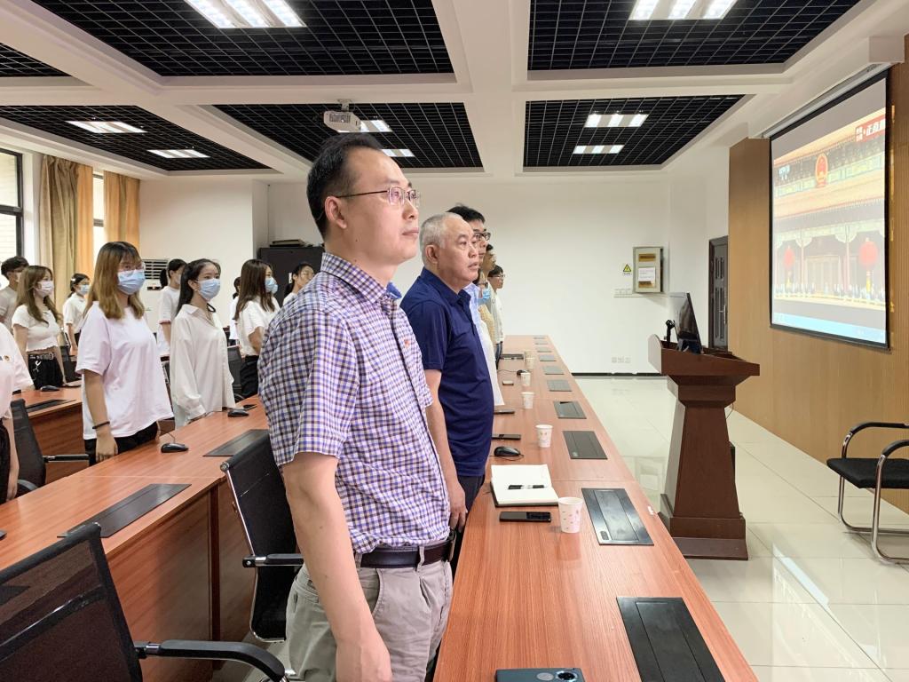 大会在庄严肃穆的国歌声中拉开序幕,与会同志带着激昂的心情将国歌唱响在整个教学楼。百年恰是风华正茂,一百年来为了拯救积贫积弱的中国,中华青年奋起反抗,抛头颅、洒热血,将奋斗融入祖国的大我,在一批批共产党人前赴后继、舍生取义的奉献中,中国结束了一盘散沙、任人宰割的局面。在中国共产党的带领下中国人民以英勇顽强的奋斗向世界庄严宣告,中华民族迎来了从站起来、富起来到强起来的伟大飞跃,我们有理由坚信没有共产党就没有新中国。