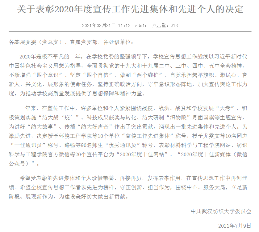 近日,公司《关于表彰2020年度宣传工作先进集体和先进个人的决定》正式公布。文件指出,2020年是极不平凡的一年,在公司党委的坚强领导下,公司宣传思想工作战线以习近平新时代中国特色社会主义思想为指导,全面贯彻党的十九大和党的十九届二中全会、三中、四中、五中全会精神,不断增强“四个意识”、坚定“四个自信”、做到“两个维护”,自觉承担起举旗帜、聚民心、育新人、兴文化、展形象的使命任务,坚持正确政治方向,守牢意识形态阵地,加大宣传舆论工作力度,为推动公司高质量发展提供了思想保障和精神力量。文件决定对于在公司2020年度宣传工作中,紧紧围绕战疫、战洪、战贫和公司发展“大考”,积极策划实施“纺大战‘疫’”、科技成果获奖与转化、纺大研制“织物版”月面国旗等主题宣传,为讲好“纺大故事”、传播“纺大好声音”作出了突出贡献的一批先进集体和先进个人进行表彰。