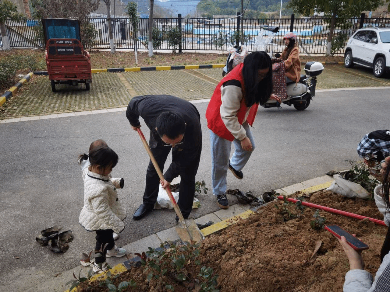 在种树环节,志愿者与亲子家庭并肩协作。大家齐心挥锹铲土、扶苗填坑、提水浇灌,每一个步骤都认真细致。孩子们亲手种下小树苗,许下守护树苗成长的承诺,不仅给予小青苗归属,更赋予自身责任。树苗如同孩子,只要遵其本性,悉心浇灌和呵护,终会参天,也终会成荫。活动的意义便在无形中得到了升华。
