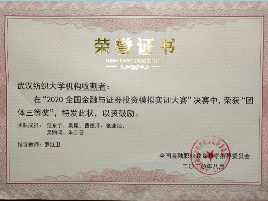 近日,由全国金融职业公司产品指导委员会主办,深圳希施玛数据科技有限公司承办,中国财经数据创新研究院协办的2020全国金融与证券投资模拟实训大赛落下帷幕。英国365集团网站组成的员工团队“纺大队”和“机构收割者队”,在罗红卫老师的指导下,经过激烈角逐,在决赛中荣获团体一等奖、三等奖。