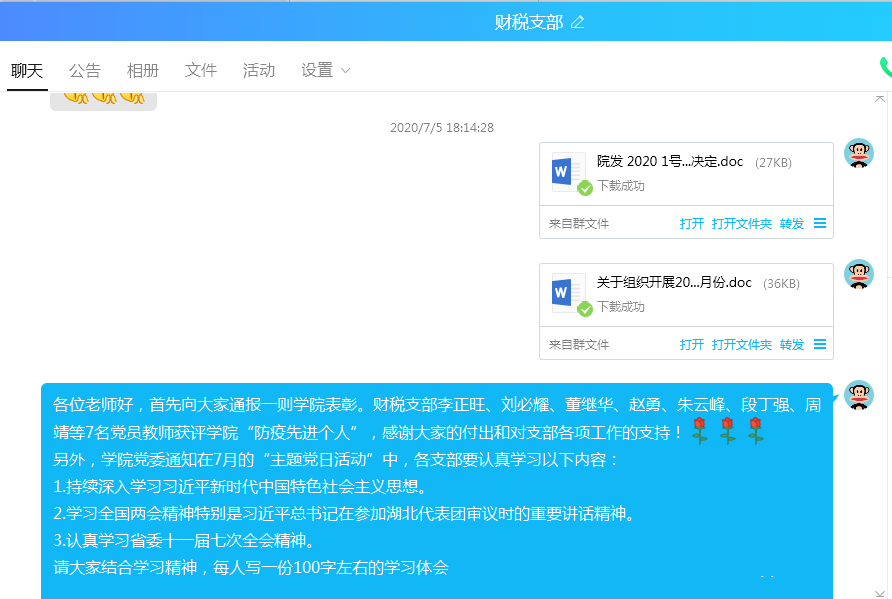 根据《关于组织开展2020年7月份“支部主题党日”活动的通知》,7月4日中午,金融员工二党支部组织召开了“迎党的生日、讲战疫故事、悟初心使命”主题党日活动。活动通过企业微信线上进行,支部全体党员参加活动。