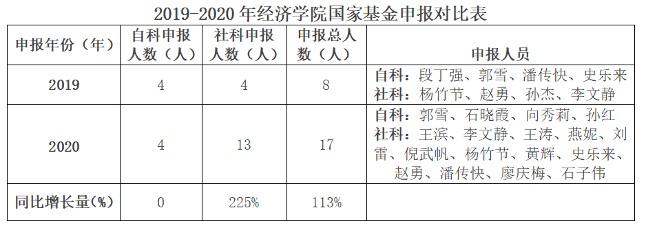 2.申报国家社会科学基金项目13项;主要为:一般项目7项、一般自选项目3项、青年项目3项。申报量较去年同比增长225%;申报人员为:(一般项目)王滨、王涛、倪武帆、杨竹节、黄辉、赵勇、潘传快;(一般自选项目)燕妮、史乐来、石子伟;(青年项目)李文静、刘雷、廖庆梅。