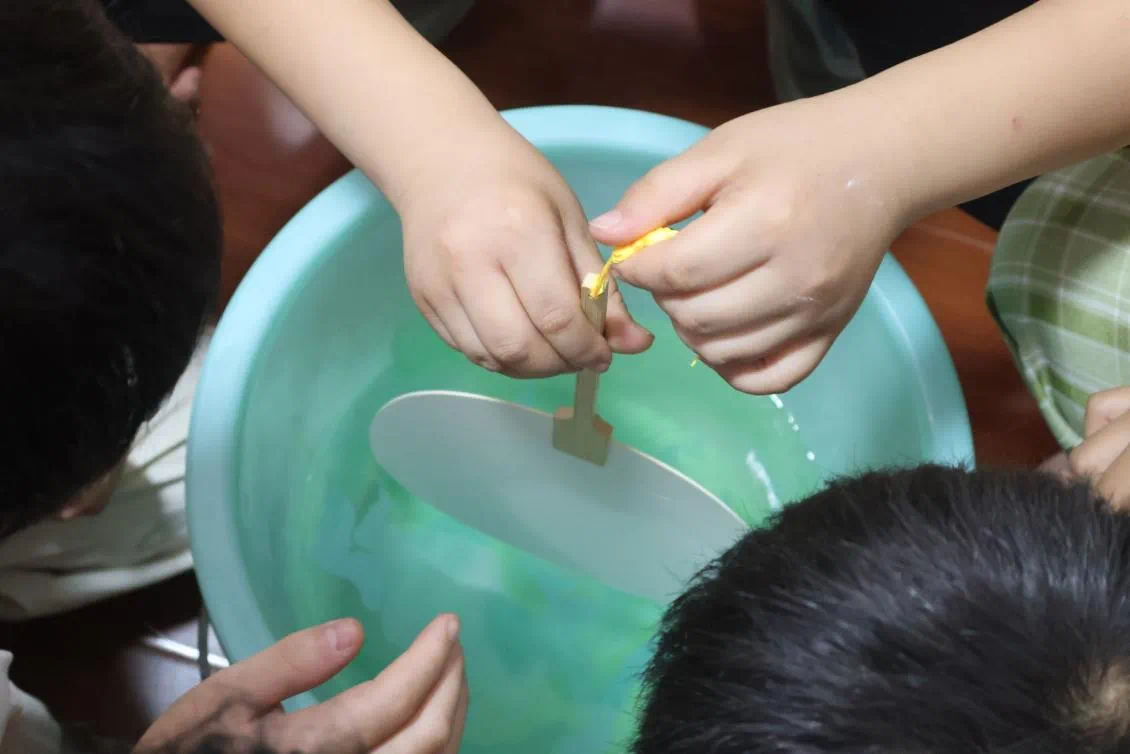 在最令人期待的漆扇制作环节,支教队员唐懿向孩子们展示了一把精致的汉绣漆扇。“这是用汉绣技艺和漆艺结合的作品,今天我们就来做一把属于自己的漆扇!”在队员们的指导下,孩子们分步骤体验了漆扇制作。调色时,天然漆滴入清水的瞬间,大家惊呼“像彩虹掉进水里啦!”孩子们握着小扇尝试“旋转法”,让水面的纹路在扇面晕染出独一无二的图案,并擦拭多余水分,小心翼翼地用纸巾轻按,生怕破坏了自己的“杰作”。四年级的危俊杰举着刚完成的漆扇兴奋地说,“我的扇面上有星星一样的纹路,像涂镇村的夜空!”活动尾声,支教队员带领孩子们朗诵了杜甫“刺绣五纹添弱线”的诗句,并教唱改编的《汉绣童谣》。“一针一线绣荆楚,漆扇摇出家乡美……”稚嫩的歌声里,孩子们相互展示自己的漆扇,扇面的纹路在阳光下流转,仿佛一幅幅流动的荆楚画卷。
