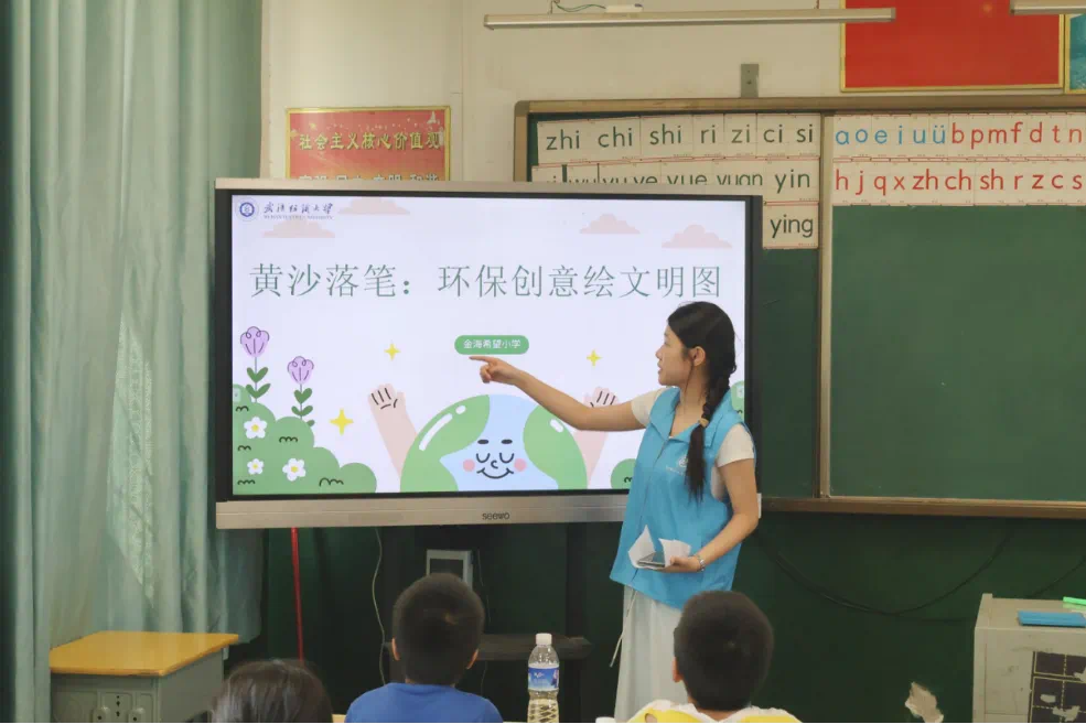 当日上午的环境保护教育以 “黄沙落笔:环保创意绘文明图” 为主题,支教队员从地球生态面临的 “黄沙侵袭” 问题切入,通过视频短片展示了土地荒漠化、塑料污染等环境现状,让孩子们真切感受到生态保护的紧迫性。课堂上,队员们引导小朋友们围绕日常环保做法展开热烈讨论,从 “随手关灯” 到 “垃圾分类”,一个个朴素答案的背后,是孩子们对 “守护家园” 的初步认知。随后,队员们系统讲解了环境保护的重要意义和具体举措,并借助趣味知识问答巩固所学。