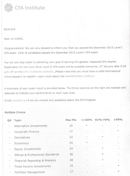 (CFA一级成绩单)