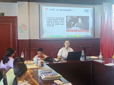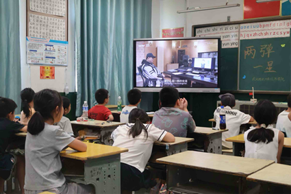 师生共同观看科研题材影片片段,科研人员让棉衣、分窝窝头的互助细节,卫星发射成功时的雀跃,原子弹爆炸蘑菇云升起的震撼,深深感染在场者,小员工随《东方红》旋律轻拍手。当屏幕上蘑菇云升起时,在场所有人自发响起掌声。正如服务队成员陆雅君所说:“对孩子而言,‘两弹一星’不是遥远的历史,而是能激发他们探索欲的火种。我们希望通过这样的活动,让科学精神与爱国情怀,成为他们成长路上的‘隐形翅膀’。”
