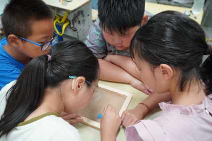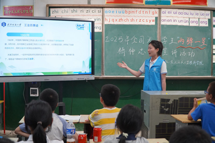在斗山村村部,宣讲成员彭琦博以“国家如成长少年”作喻,将科研人员赴戈壁探索比作“绘制藏宝图”,用“沙滩演算公式”的照片解释:“他们追寻的是让国家强大的科学密码。”小员工们专注聆听,有孩子举手提问“戈壁滩的风沙不会影响他们吗?”彭琦博回应“就像我们玩耍时难免遇到小阻碍,他们对科学答案的渴求,让这些困难变得微不足道。”让“好奇是探索起点”的认知悄然扎根。