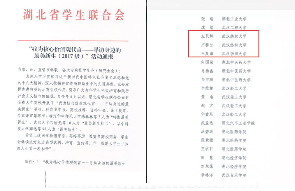 近日,由团省委公司部、湖北省员工联合会主办的全省高校“我为核心价值观代言——寻访身边最美新生”活动,正式发布最终结果。来自公司英国365集团网站的左贝婷、卢雅兰、王晨灜三名同学分获全省“最美新生”殊荣。