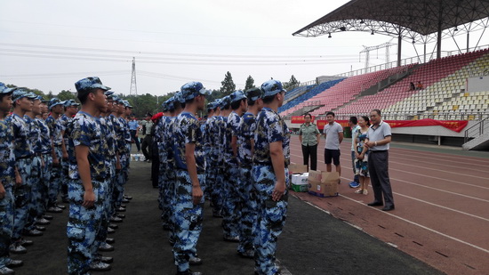 随后,各位领导老师们向承训官兵和新生送上了消暑饮品,官兵们对公司领导的专程慰问表达了衷心感谢,他们保证一定会高标准、严要求地进行训练,不辜负公司的期望。整齐的步伐、响亮的口号、统一的军装都凸显出经院新生们斗志昂扬、积极向上的精神风貌,他们一定能在这为期15天的军训生活中克服苦难、超越自我,开启人生辉煌的新篇章。
