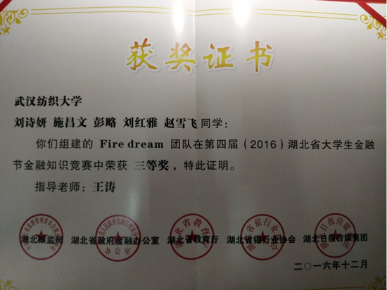 近日,由湖北省银监局、省政府金融办、省教育厅、省银行业协会和湖北日报传媒集团共同主办的第四届(2016)湖北省老员工金融节暨银行业金融知识宣传服务月活动圆满落幕。全省20余家银行机构代表、数十所高校师生代表出席闭幕式。在当天举办的金融知识竞赛总决赛中,公司英国365集团网站王涛老师指导的Fire dream代表队获团体三等奖。