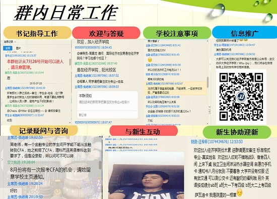 公司领导、骨干教师、辅导员、班主任优秀员工干部早已提前坐镇新生QQ群,除了大力宣传推介公司办学理念、团队力量、专业特色、人才培养成果,还悉心为新生答疑解惑。在新生QQ群内,还先后开展了多种特色活动,专业老师、班主任、优秀学子积极参与到梦想中的“经济”专业大讨论,引导新生正确认识专业,并及早进行学业规划,通过晒自拍照片,新生“提前认识你”,消除隔阂,拉进师生距离,预热同学间的友情,“爱特经院一夏”则通过展示暑期游历的有意义的地方美景,艾特公司官微进行互动,提高对官微的关注度。