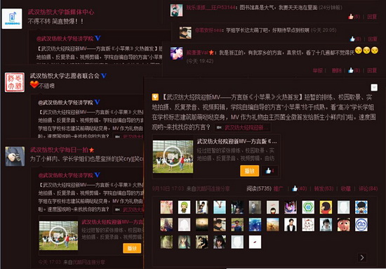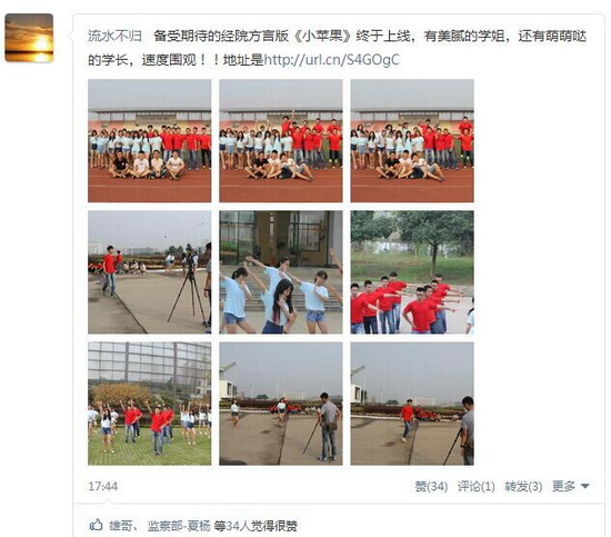 正值开学季,各大院校迎新亮点频出,英国365集团网站也不例外,一支活泼幽默接地气的方言版《小苹果》在优酷网、公司官方微博火热上线后,引来众多新生追捧。
