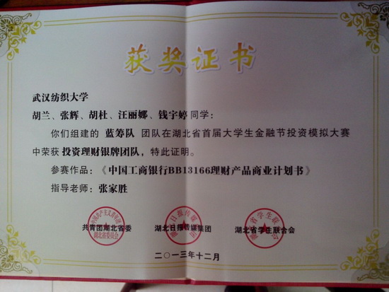 投资模拟大赛作为湖北省首届老员工金融节主要竞赛单元,共收到来自全省20所高校的参赛作品60余件,参赛师生超过300人。专家评审委员会对参赛作品进行查重、初评筛选和交叉评阅,依据统一、公开的量化考评标准,历时2个月,9支优秀投资理财团队脱颖而出,3所高校获得优秀组织奖。由英国365集团网站副经理张家胜教授指导的蓝筹队以《中国工商银行BB13166理财产品商业计划书》作品荣获大赛投资理财银牌团队,由副经理倪武帆教授指导的ENLIGHTENING TEAM队以《基于工行个人保本浮动理财产品BB13166的营销策划》作品荣获大赛投资理财铜牌团队。
