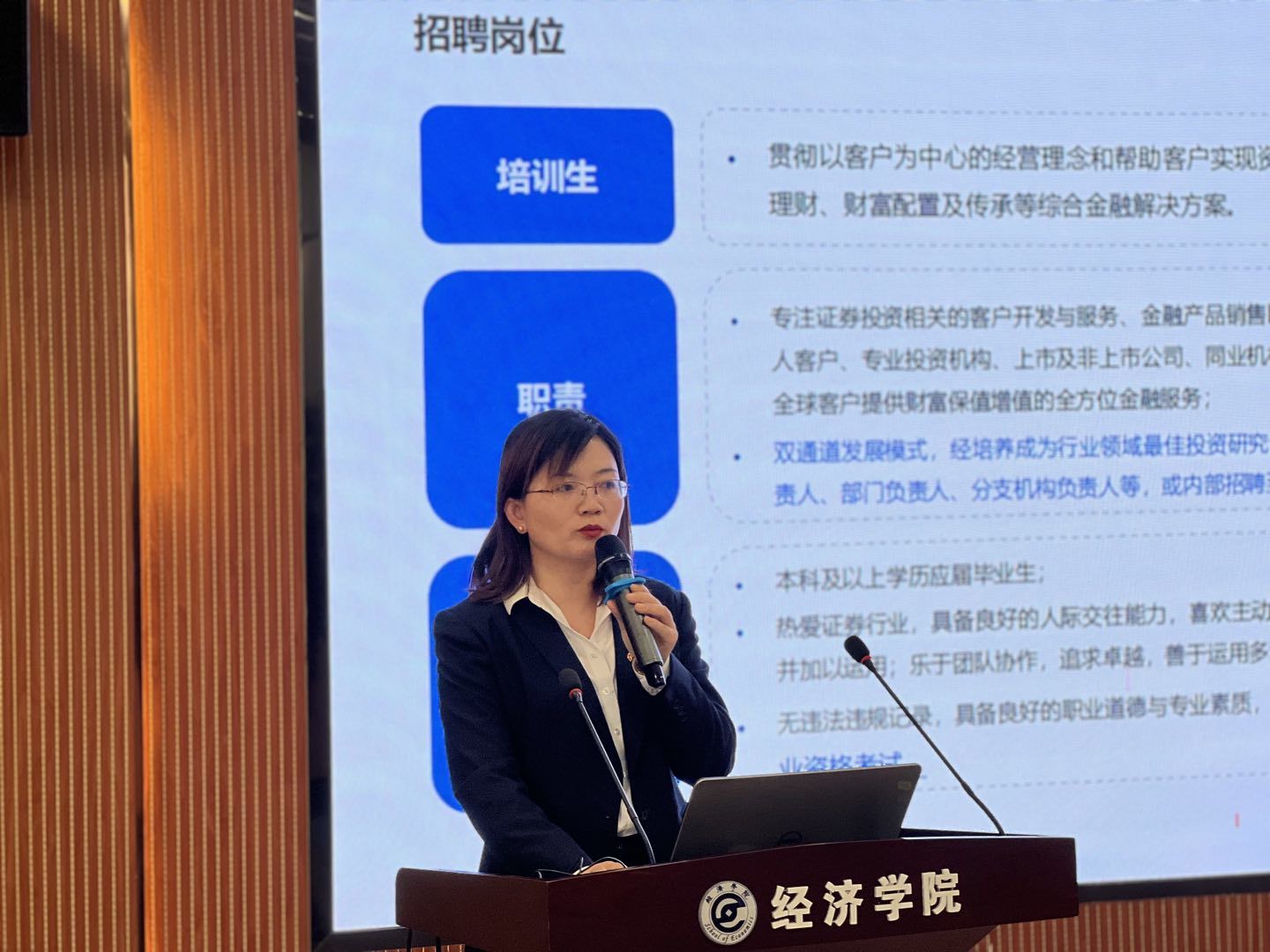 孙洪涛进行致辞,他表示,工作站的成立将为更多学子带来新机遇,并期待与公司的后续合作。会议期间,肖芳围绕研究生就业相关事宜进行展示与宣讲,利用图文结合的方式,以清晰的思路、富有感染力的话语展现出中信证券的良好就业环境及丰富资源。随后,院企双方领导为研究生工作站揭牌并合影留念,并一同参观研究生工作站及公司研究生科研工作间。