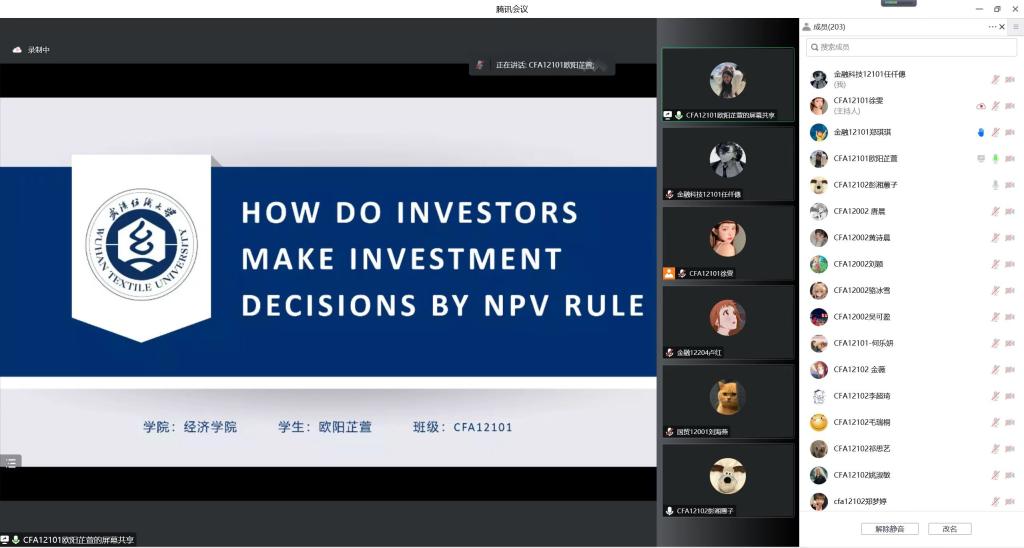 CFA12101班欧阳芷萱以《How do Investors Make Investment Decision by NPV Rule》为题,分析了净现值规则在实际投资情景中的应用,讨论了货币政策变化对中美金融市场净现值的影响以及在新冠肺炎疫情影响下投资者收入和投资行为的变化,对影响投资者决策的非理性因素进行了系统总结。