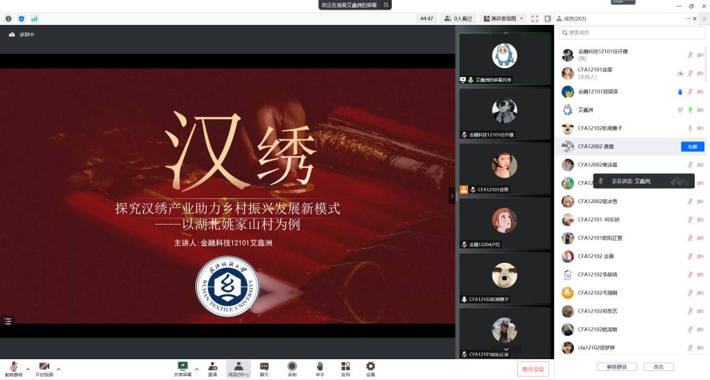 金融科技12101班艾鑫洲以《探究汉绣产业助力乡村振兴发展新模式——以湖北姚家山村为例》为题,分析了姚家山村汉绣产业发展面临的困境以及发展优势,展示了团队在暑期实践中帮助姚家山村创作的系列成果,指出为乡村谋出路、谋发展是新时代的“三农”工作突出主题,探索将非遗与乡村振兴相结合,构建以非物质文化遗产为载体的乡村振兴新模式。