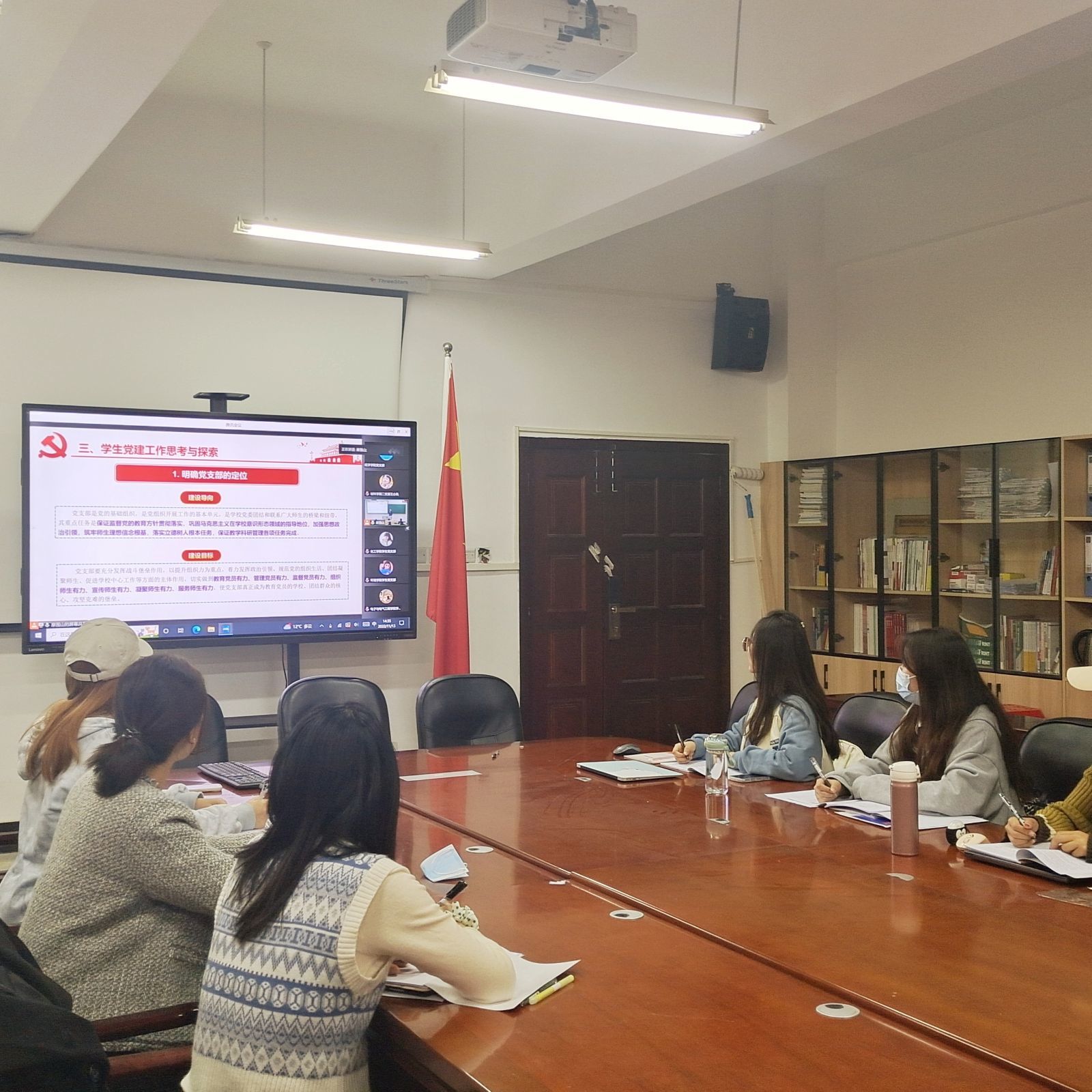 为组织公司各党支部深入学习、集中交流,贯彻落实公司党委部署要求,11月13日,2022年度校员工党支部书记培训班在阳光校区9号教学楼320、322教室举行。公司各员工党支部书记到场参加培训,各员工党支部副书记于崇德楼315(左)会议室以线上方式观看学习。