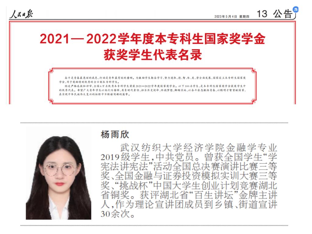 时值“五四”青年节,《人民日报》分两版刊登2021—2022学年度本专科生国家奖学金获奖员工代表名录,集中推介展示100名本专科国家奖学金获奖员工优秀代表风采。公司金融11902班杨雨欣同学作为我省4名代表之一(省属高校唯一)、也是全国6万名获奖员工的代表,入选名录。