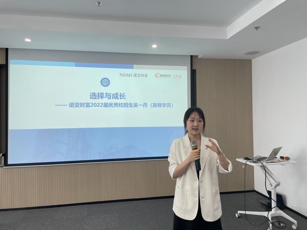 诺亚财富湖北区优秀校招生吴一丹带着员工们去参观了诺亚财富的员工办公区、获奖展览室和接待区,让同学们对诺亚财富有了初步的了解。诺亚财富公司中西大区武汉片区产品总监文静向同学们介绍金融行业、诺亚财富的公司背景、部门架构等,并向同学们提出有关择业的一些建议。高顿教育优秀学员内推诺亚财富的优秀校招生吴一丹进行职业选择和个人成长分享。在接下来的自由交流与互动环节,纺老员工踊跃提问,现场气氛活跃热烈。