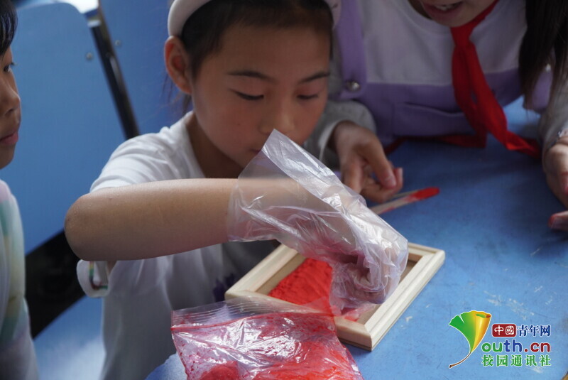 图为孩童亲自体验用纸浆画制作五星红旗。中国青年网通讯员 郑钦月 摄