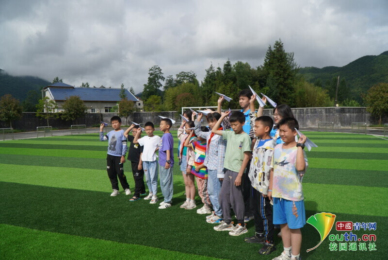 图为实践队成员和孩子们一起放飞载满心愿和烦恼的纸飞机。中国青年网通讯员 郑钦月 摄