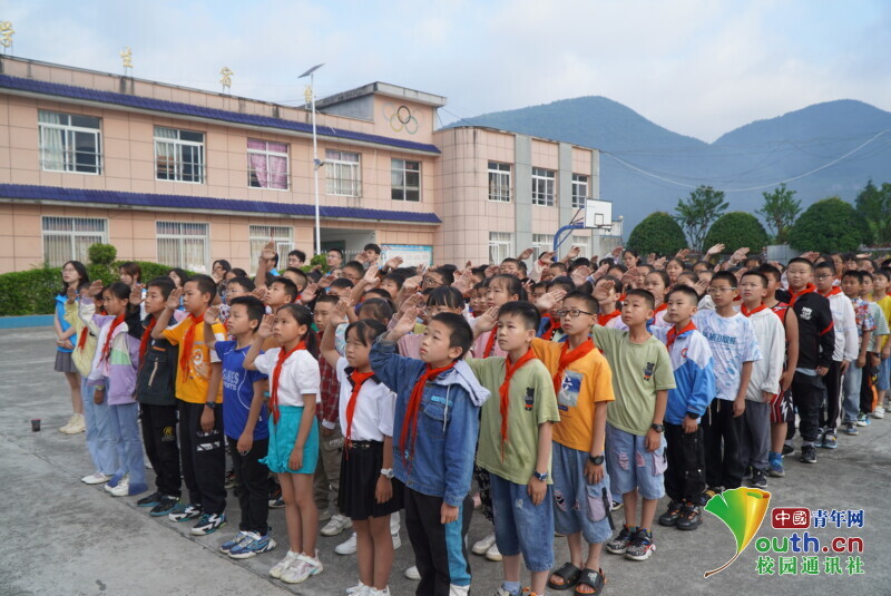 图为实践队成员们和孩童们一起参加升旗仪式。中国青年网通讯员 郑钦月 摄