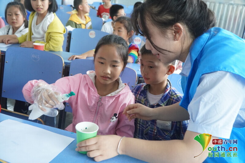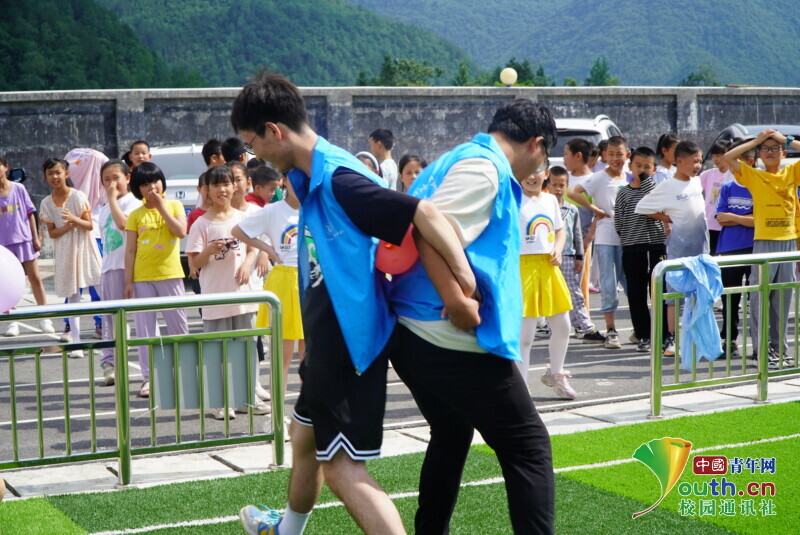图为实践队成员为孩童们演示“同甘共苦”游戏。中国青年网通讯员 郑钦月 摄