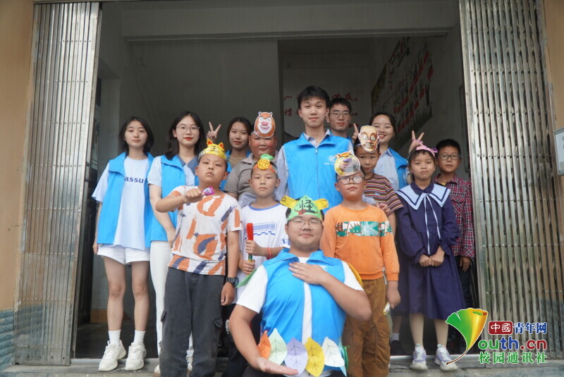 图为实践队成员和孩童们演出“熊出没”情景剧后合影留念。中国青年网通讯员 郑钦月 摄