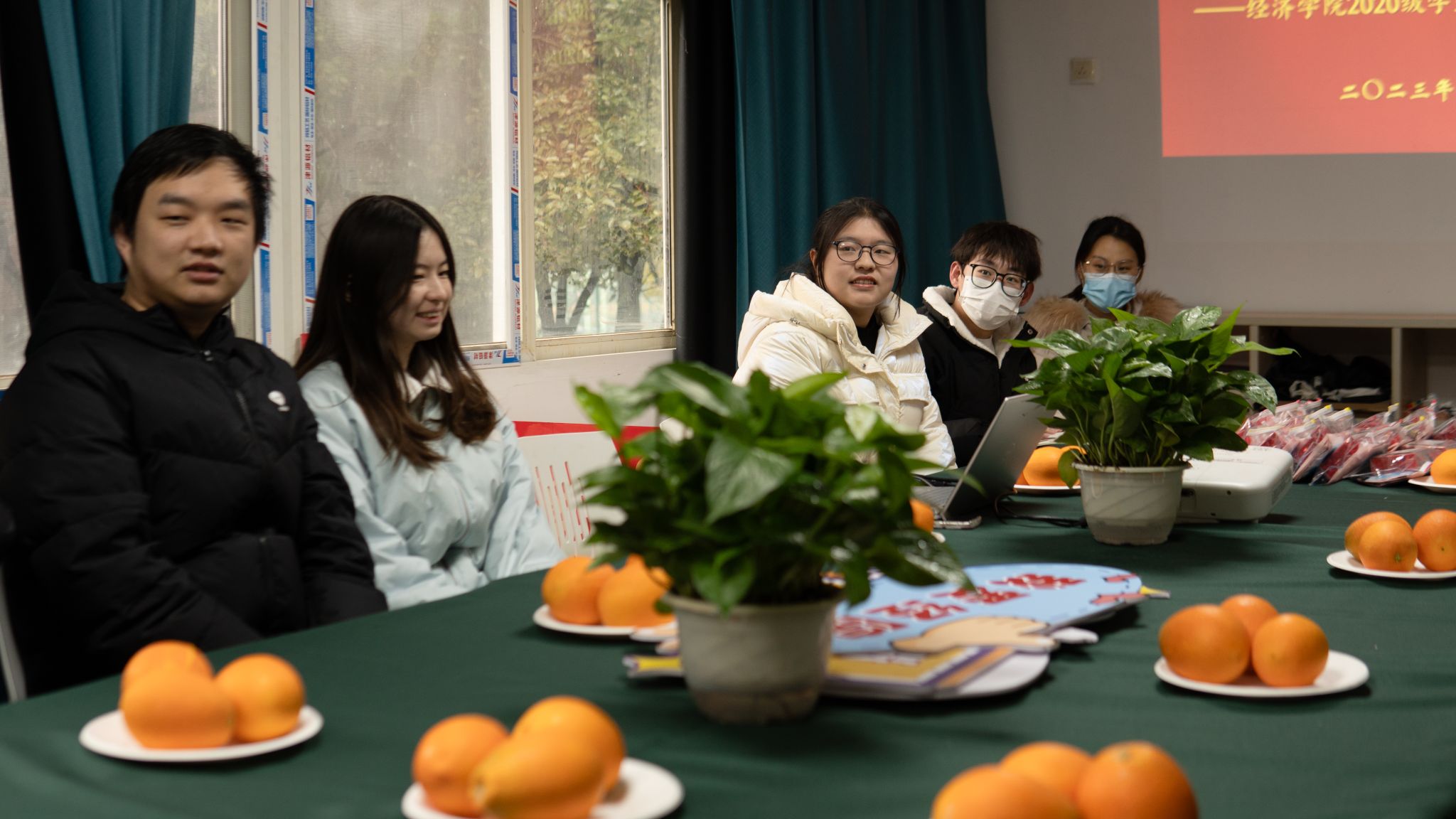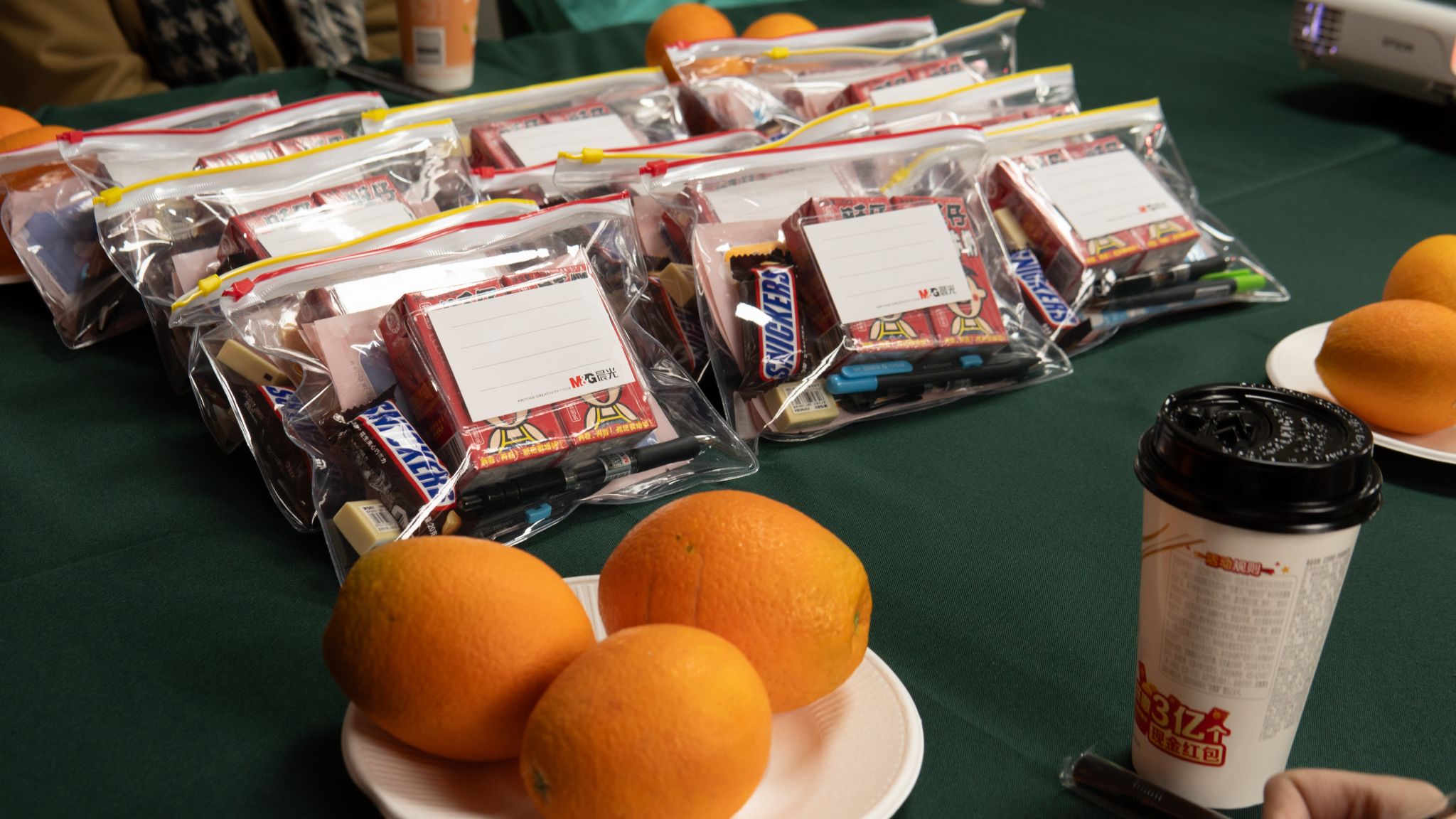 2023级员工代表刘欣荣带来家乡特产——脐橙,代表2023级全体员工为学长学姐送出考研祝福,寓意心想事“橙”,祝愿考研学子考试顺利,马到“橙”功。