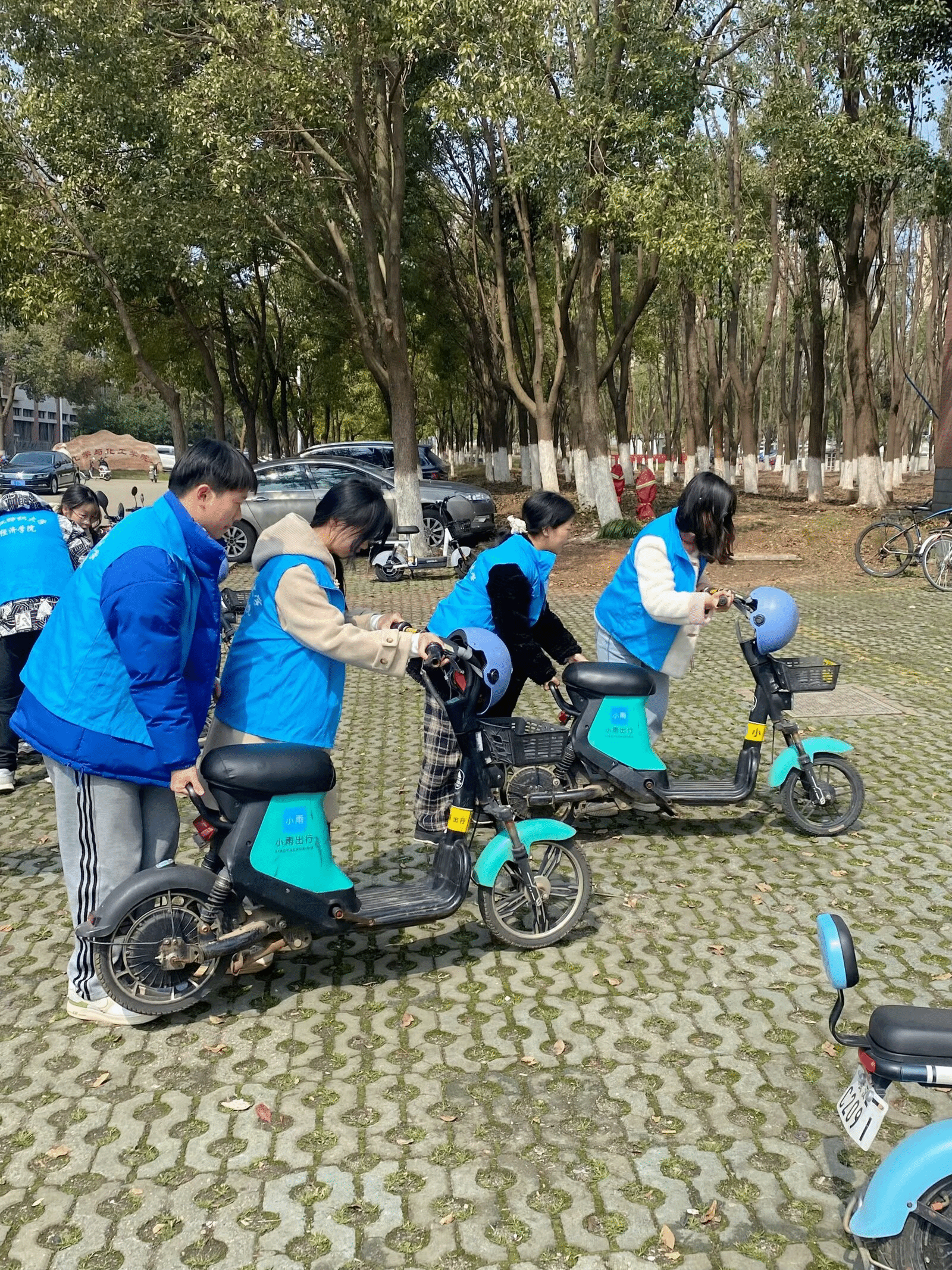 活动开展期间,志愿者们以高度的责任心和使命感,分工明确、协同合作。他们细心地将人行道上乱停乱放的电动车移至指定区域,确保每一辆电动车都整齐划一地停放在车位上。同时,志愿者们还积极向过往的同学宣传文明停放电动车的重要性,并提醒他们将车辆停放在规定位置,共同维护道路通畅和校园环境美观。