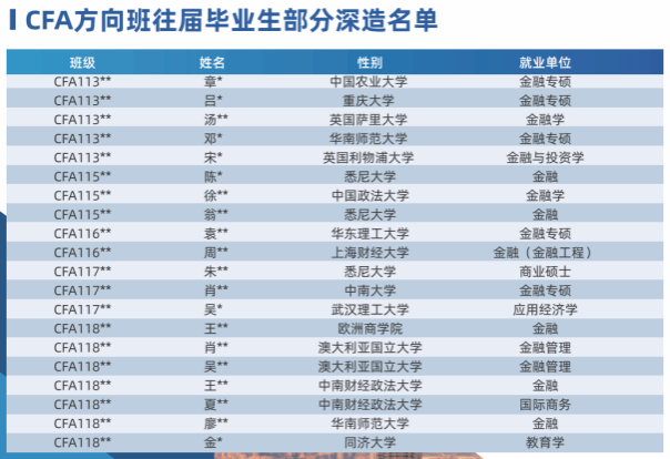 l 海外留学深造绿色通道。借助企业资源与国外院校建立良好的合作关系,CFA方向班学员毕业后可选择申请进入西东大学、俄勒冈州立大学、密苏里大学、威尔士班戈大学、朴次茅斯大学、切斯特大学等公司留学深造,部分公司将会提供入学绿色通道。通过方向班金融英语及专业金融知识的学习,更容易申请国外院校留学深造。