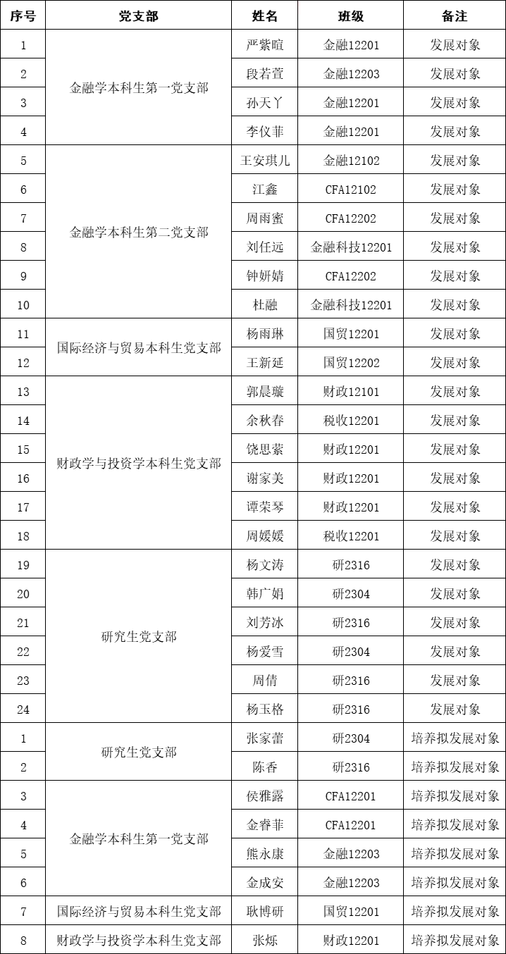 根据《中国共产党章程》和《中国共产党发展党员工作细则》规定,经基层团学组织推荐、综合考评考察、党支部审议、公司党委审查决定,拟将以下24名员工列为发展对象、8名员工列为培养拟发展对象,现予以公示: