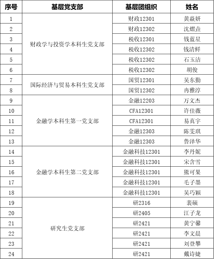 根据《中国共产党章程》和《中国共产党发展党员工作细则》,按照发展党员相关工作规定,经培养考察、政治审查、理论测试、述评述议、群众座谈、民主评议等环节,经各基层党支部支委会研究决定并报公司党委审议,拟确定以下24名发展对象为预备党员,现予以公示: