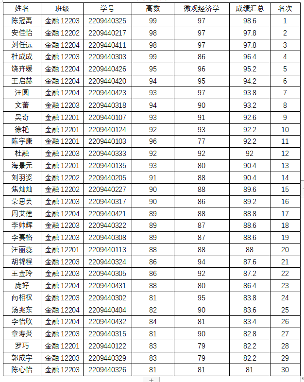 2、选拔方式:按前一个学期的核心必修课程的平均成绩(高等数学*0.8+微观经济学*0.2)进行排序。若有挂科重修的科目,按第一次考试的成绩计算。若有某员工由于转专业或是缓考等情况导致该课程无成绩时,该课程计0分。
