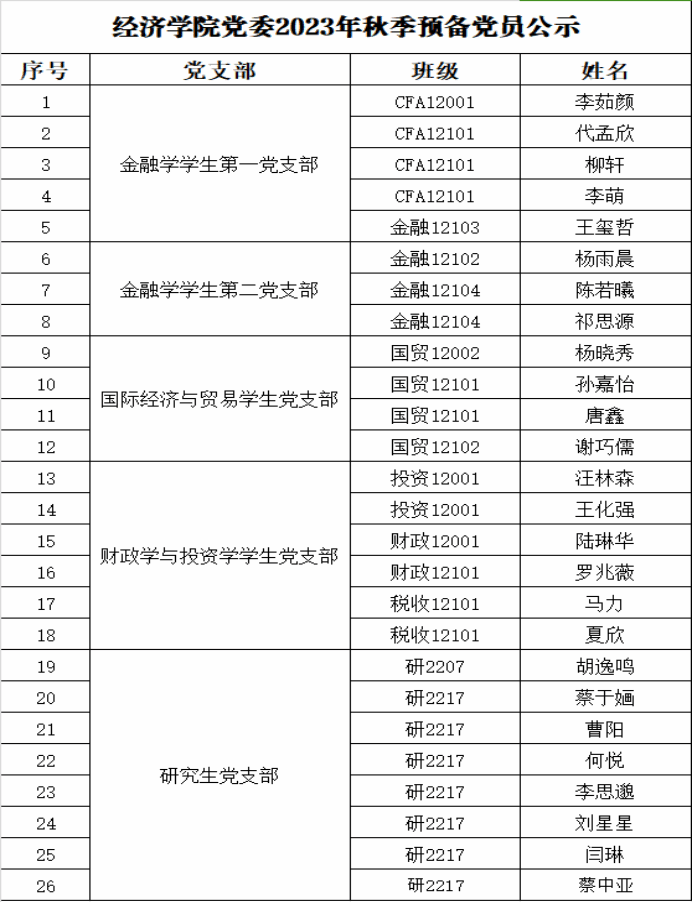 根据《中国共产党章程》和《中国共产党发展党员工作细则》,按照发展党员工作有关规定,经支部委员会研究和公司党委审核,拟确定以下26名同志为预备党员,现予以公示: