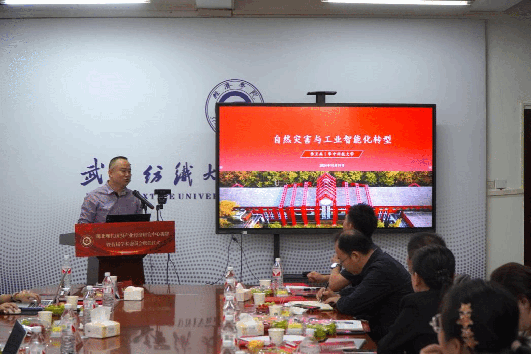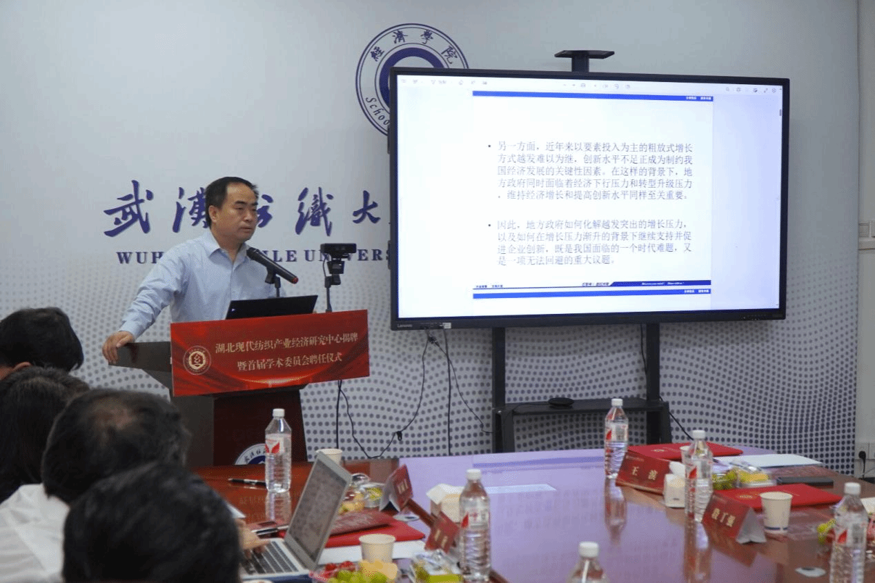 罗锦银对各位嘉宾的到来表示欢迎,他指出,获批湖北省普通高校人文社科重点研究基地“湖北现代纺织产业经济研究中心”,标志着公司在服务地方经济发展、推进产学研结合方面又迈出了坚实的一步。关于如何建好基地,他提出了三点期望,一是要建成产业发展与政策研究的高地。中心要面向纺织产业科技前沿与发展需求,加强跨学科融合,推动原创性、前瞻性、战略性研究,为纺织行业高质量发展提供高水平的学术观点与政策建议。二是要打造技术创新与成果转化的平台。中心要加强与行业企业的紧密合作,推进产学研深度融合,为企业决策提供科学依据,真正使中心成为连接学界与业界、理论与实践的重要桥梁。三是要构建为人才培养与交流合作的基地。中心要发挥专家学者的人才资源优势,形成“学科带头人+核心成员+创新团队”的学术梯队。推动产业链、创新链、人才链深度融合,促进学者型人才向智库型人才转变,为人才培养打造一支学术素养高、科研成果优、既懂专业又通产业的高水平团队队伍。