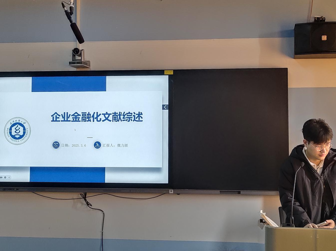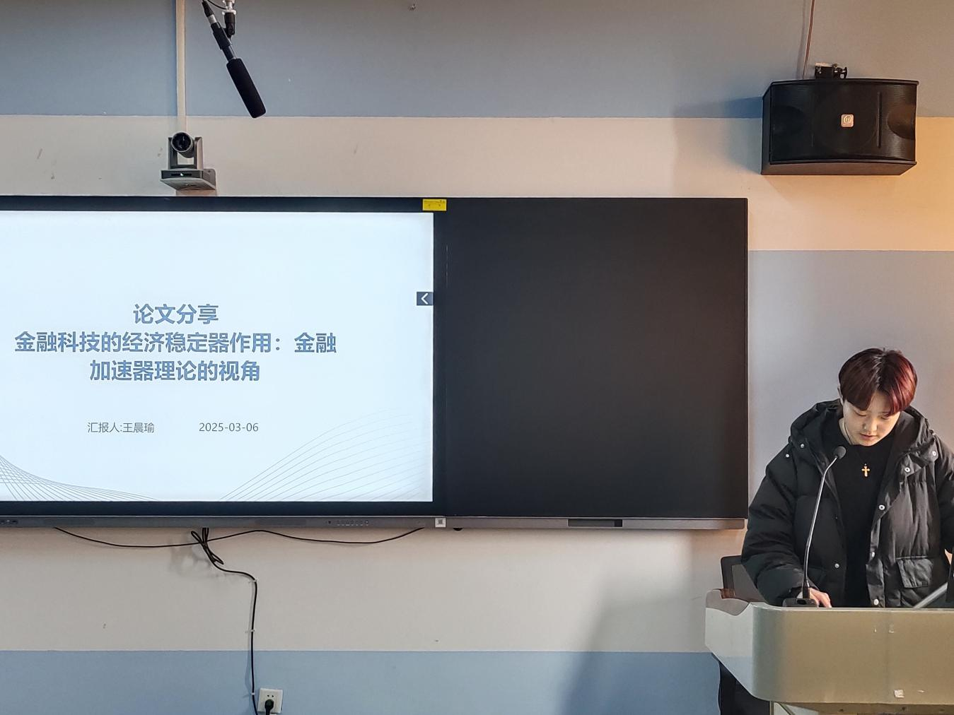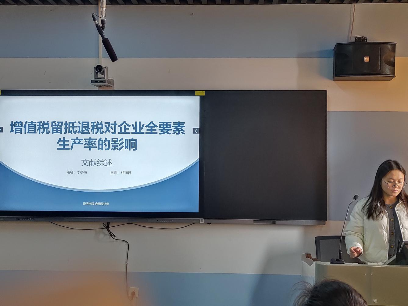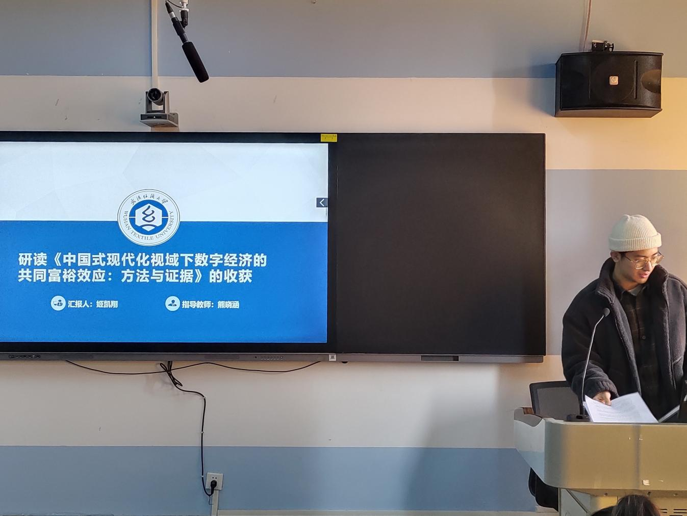 论坛上,五位主讲人依次以PPT的形式展示了近期研读的学术成果。魏力源同学以《企业金融化文献综述》为题,系统梳理了企业金融化的内涵、动因、经济后果等方面的相关文献,总结现有研究成果并对未来研究方向提出展望。姬凯翔同学以《中国式现代化视域下数字经济的共同富裕效应:方法与证据》为题,明晰了数字经济在中国式现代化进程中推动共同富裕的作用机制及实质证据,对后续深入探究相关领域研究方向有了新启发。姜建民同学以《市场激励型环境规制驱动下的绿色经济转型》,归纳了现有研究中关于市场激励型环境规制和绿色经济转型之间的关系、实现路径及影响因素的观点,并指出了当前研究的不足与未来的研究方向。季冬梅同学以《增值税留抵退税对企业全要素生产率的影响研究文献综述》为题,系统总结了增值税留抵退税与企业全要素生产率关系的相关研究,涵盖影响机制、实证结果及尚存的研究空白与未来方向。王晨瑜同学以《金融科技的经济稳定器作用:金融加速器理论的视角》为题,从金融加速器理论出发,分析了金融科技在调节经济波动、降低金融市场摩擦方面作为经济稳定器的具体作用,并阐述了相关研究成果。每位主讲人都展现出自信从容的精神面貌,以积极的求知欲和严谨的态度诠释了勇于创新、追求卓越的研究生精神。