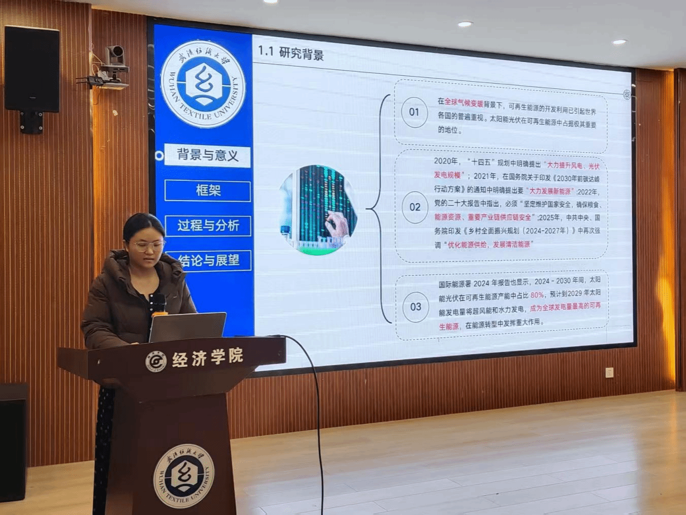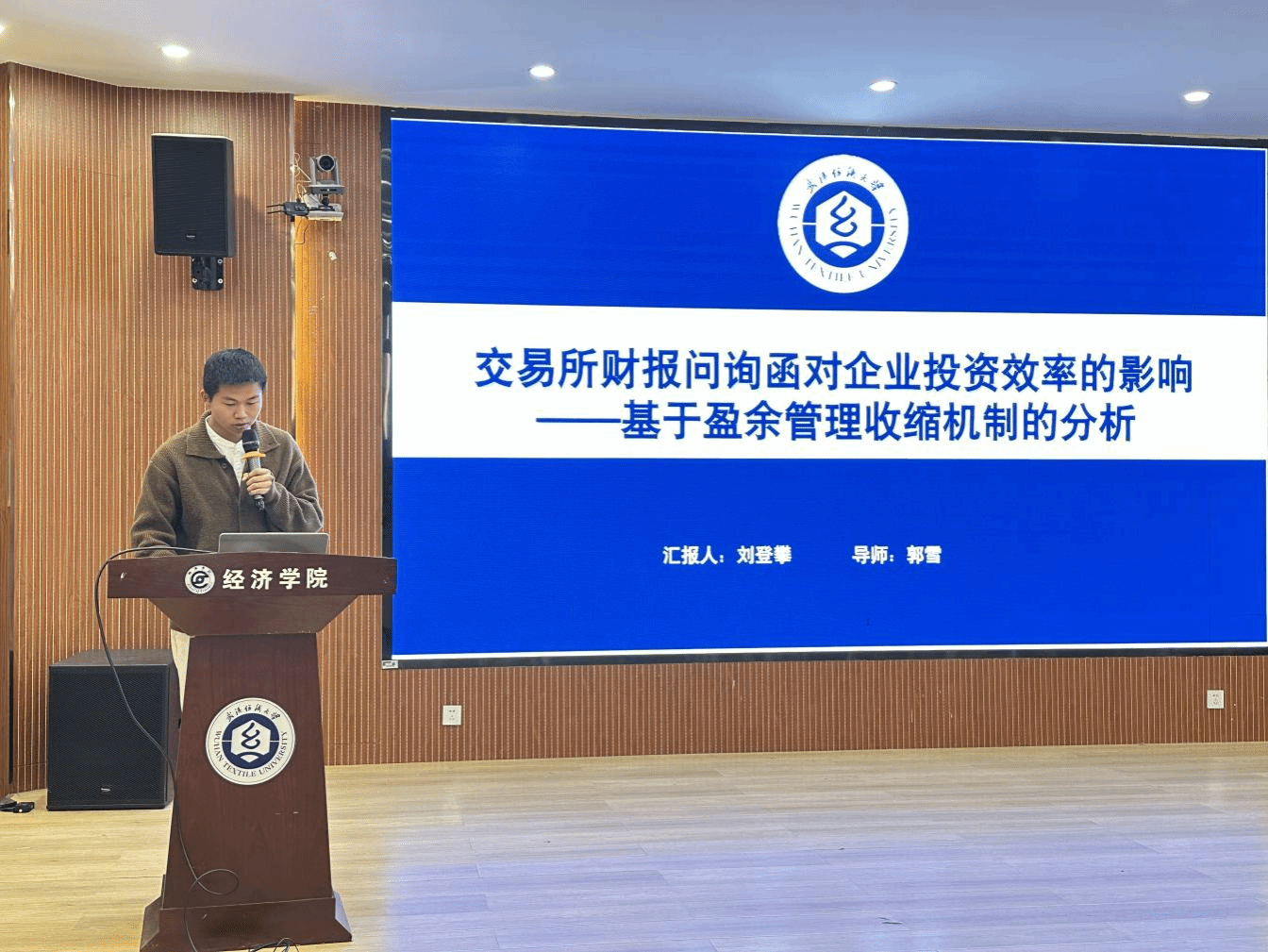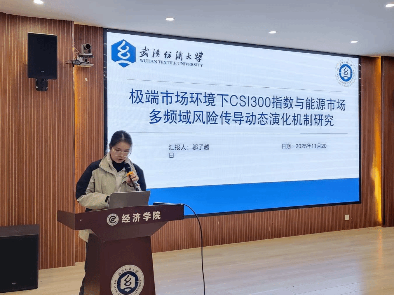 在本次论坛中,五位主讲人分别围绕其近期研究成果进行报告。吴媛媛同学以《中美印光伏产业链风险传导机制——基于动态演化博弈模型》为题,聚焦三国产业链布局差异与风险传导规律,运用动态演化博弈模型解析关键节点与演化路径,结合实证数据呈现传导逻辑与防控重点,为相关研究提供量化分析视角。邬子越同学同学以《极端市场环境下CSI300指数与能源市场多频域风险传导动态演化机制研究》为题,聚焦极端情境下两类市场风险传导的多频域特征,解析不同时间尺度下的动态演化规律结合量化模型揭示风险传导关键路径。胡东灿同学以《从“言而有信”到 “数而有信”:信任机制的数字化转型——来自企业融资约束的证据》为题,聚焦信任机制数字化转型的核心逻辑,结合企业融资约束的微观证据,剖析数字化对信任构建的赋能路径与经济效应。潘俊如同学以《企业数字化转型测度研究进展》为题,系统梳理学界主流测度方法与指标体系,对比不同方法的适用场景与优劣,剖析当前研究的热点争议与前沿方向,清晰呈现该领域研究脉络与发展趋势。刘登攀同学以《交易所财报问询函与企业投资效率:基于分析师预测的中介视角》为题,聚焦财报问询函的治理效应,以分析师预测为中介变量,剖析其对企业投资效率的影响机制与传导路径。