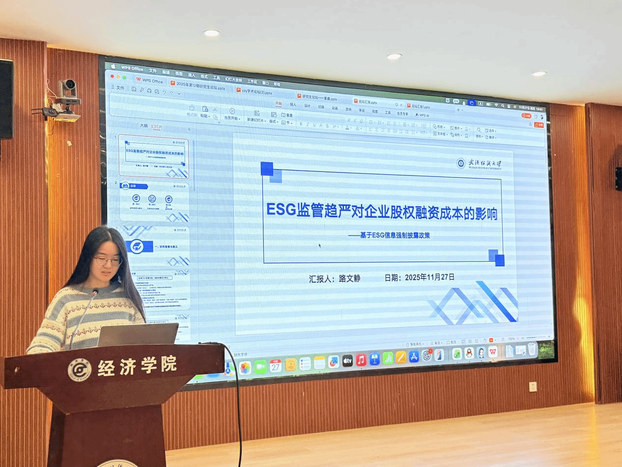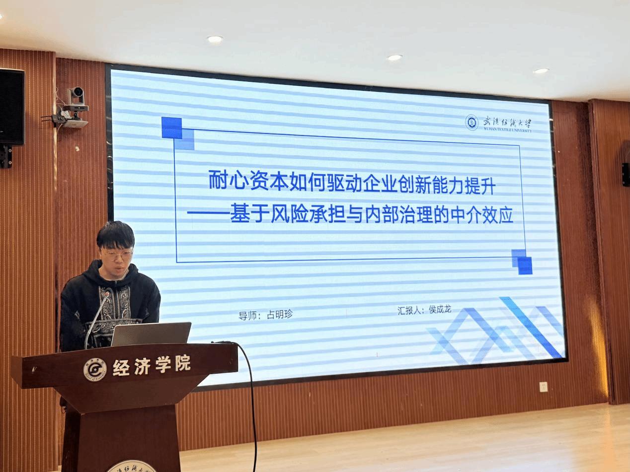 论坛分享环节,五位主讲人从学术研究与实践竞赛两大维度展开精彩分享。夏鑫同学以《机构共同持股对企业债务融资成本的影响》为题,聚焦资本市场股权结构,剖析机构共同持股降低信息不对称、优化债务融资环境的作用机制,为企业融资成本管控提供学术参考。赵福同学以《数字普惠金融对农村寄递物流水平的影响研究》报告,基于农村发展数据,实证分析数字普惠金融对寄递物流网络完善、效率提升的赋能效果,为农村基建提供新思路。路文静同学围绕《ESG监管趋严对企业股权融资成本的影响——基于ESG信息强制披露政策》,结合政策背景探究ESG信息强制披露对股权融资成本的调节作用,为企业合规与融资优化提供理论支撑。侯成龙同学以《耐心资本如何驱动企业创新能力提升?——基于风险承担与内部治理的中介效应》为题,聚焦耐心资本资源配置功能,揭示其通过影响企业风险承担与内部治理驱动创新的内在逻辑。陈子悦同学分享《竞赛经验分享——商业精英挑战赛》,结合参赛经历从团队组建、方案设计、答辩技巧拆解备赛要点,分享实战经验与感悟,为同学参与学术竞赛提供实用指导。