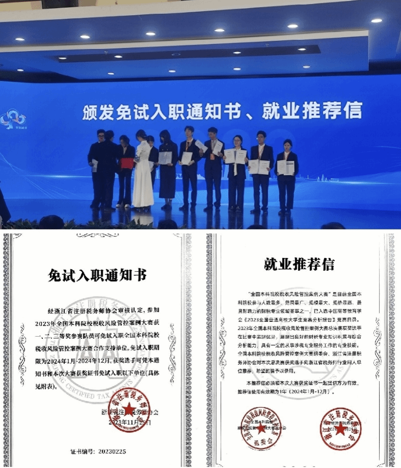 在总决赛中,公司学子以扎实的专业知识、高质量的案例作品与优异的现场表现获得了行业评审专家的高度认可。浙江省注册税务师协会行业党委常务副书记、会长邢幼平在现场直接为获奖选手们颁发了免试入职文件与就业推荐信,选手们获得了十余家税务师事务所的免试入职机会。