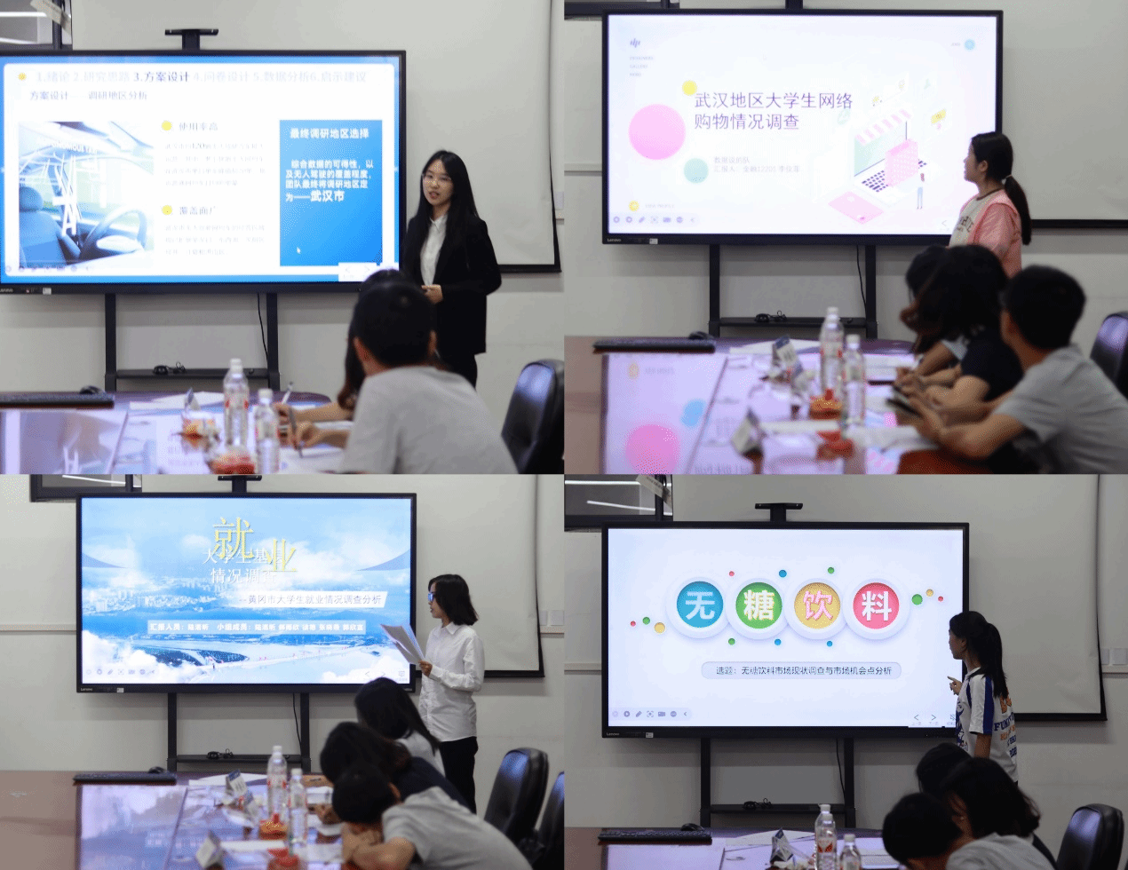在答辩会上,17个课题团队围绕“老员工就业创业”,“网络购物”,“新农业电商发展”,“无糖饮料的市场现状”等多个方面,多思路、多视角汇报了本团队的目前调研构想。李仪菲从社会调研数据出发,分析得出老员工的网络购物行为及其背后的心理态度,对于引导健康消费、维护网络市场秩序具有重要意义;程佳慧介绍了其团队的调研目的,即通过本次数据调研,为高等教育机构提供策略建议,帮助他们更好地设计和实施相关教育政策和服务项目,同时也为员工个人提供参考,帮助他们做出更符合自身发展需要的选择;汪丽蕊着重分析了无糖饮料市场现状与市场机会点,通过问卷调查、市场观察、趋势分析、产品测试等多种调研方法,探讨了无糖饮料的市场容量、竞争格局、发展趋势,为企业产品开发,市场营销等方面提出了宝贵建议。答辩现场气氛热烈,同学们积极展示研究成果,交流分享社会实践构想。