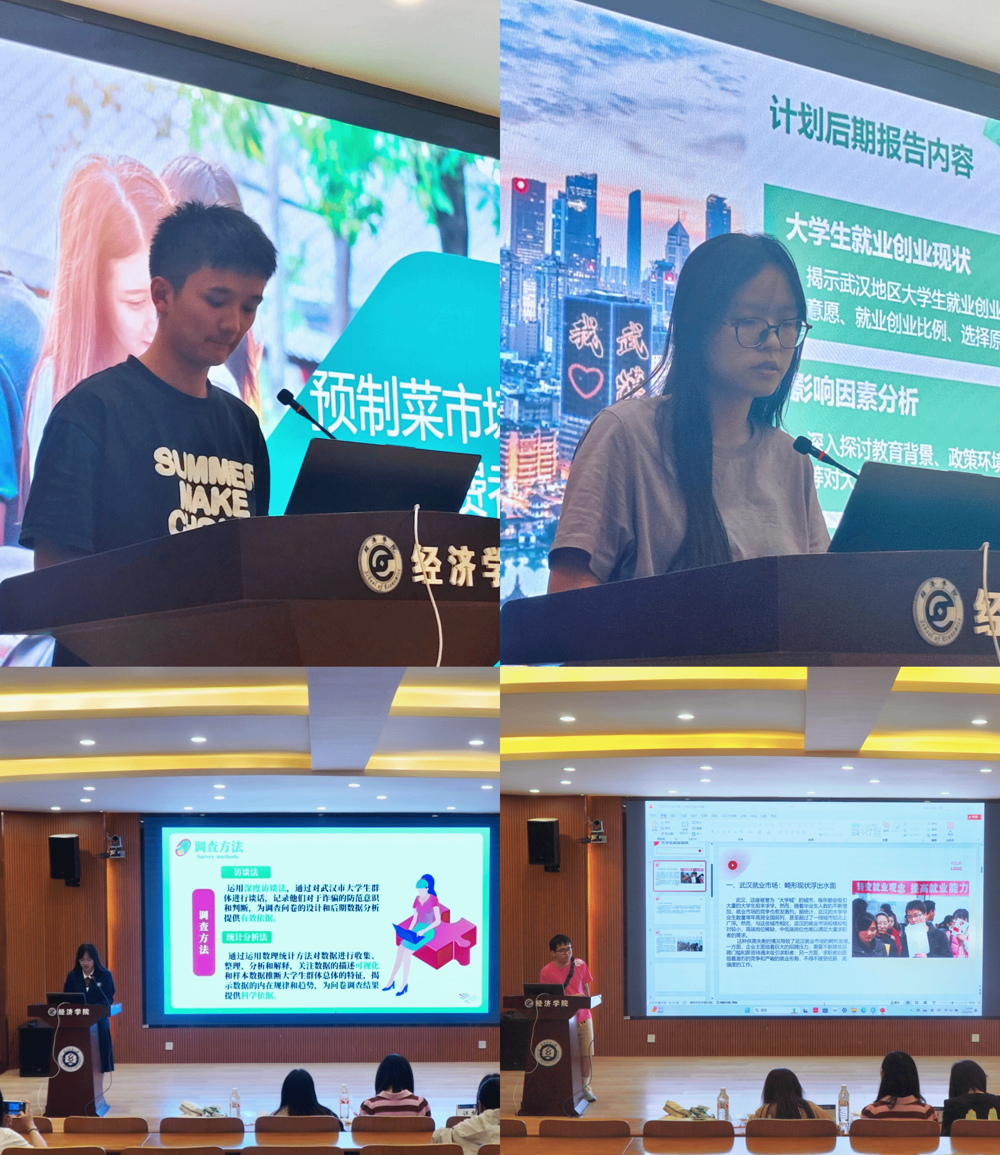 答辩过程中,十六位答辩人分别从研究背景、研究目的、研究思路以及研究预期等方面进行了汇报。张诗悦基于村镇银行经营现状,分析了其面临的风险,并在风险应对与结构优化方面提出了小组的解决方案,同时对村镇银行的未来定位和发展进行了预期展望;莫金瑜从研究背景与意义出发,讲述了预制菜市场调查的实施目标以及方案,结合目前数据对未来市场趋势进行了预测和分析;王金玲着眼于当代社会的无糖趋势,探讨了农村的无糖生活方式,针对调研开展方向进行了详细介绍;张巧云结合武汉的城市发展潜力与未来就业市场的形势,介绍了小组关于老员工留汉就业创业的调研方向,并就相关数据分析后得到老员工留汉工作有积极预期这一结论。各答辩人将自己团队的当下调研成果和预计调研开展方向从不同的角度进行阐述,答辩内容完整,循序渐进、深入浅出。