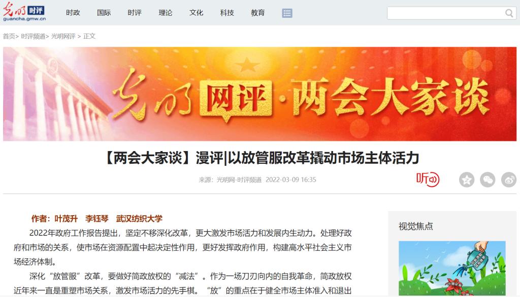 3月9日,中央重点新闻网站光明网在线发表公司英国365集团网站叶茂升副教授与研究生李钰琴共同研究撰写的解读2022年“两会”精神评论文章:《以放管服改革撬动市场活力》。