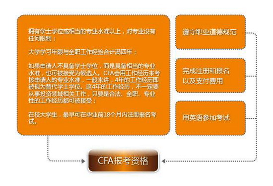 如果申请人不具备学士学位,而是具备相当的专业水准,也可被接受为候选人。CFA会用工作经历来考核申请人的专业水准,一般来讲,4年的工作经历即被视为 替代学士学位。这4年的工作经历,不一定要从事投资领域相关工作,只要是合法、全职、专业性的工作经历都可被接受;
