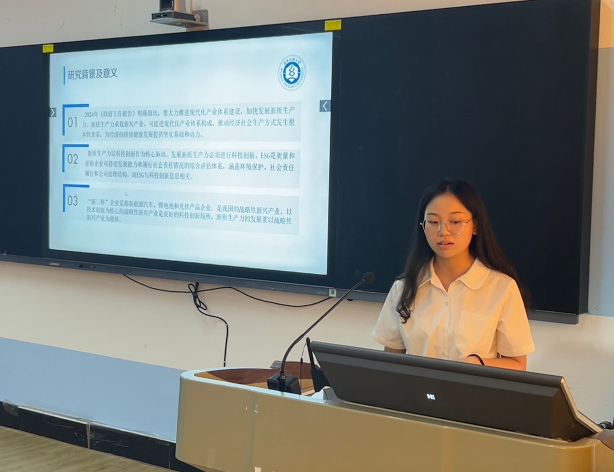 论坛上,四名主讲人基于各自的研究方向,从不同的角度和层次向老师和同学们分享最近的学术研究和创新竞赛成果。陈香同学以“新三样”上市公司为例,进一步分析ESG发展对企业新质生产力的影响;马瑞雪同学展示今年暑期开展的关于怀宁蓝莓产业赋能乡村振兴的三下乡社会实践活动;刘星雨同学通过介绍其参加商业精英挑战赛的进度过程向同学们分享品牌策划竞赛的成功经验;周娜同学提出绿色金融对全要素能源效率的影响及空间效应研究。每位同学在各自不同的角度对自己的学术和竞赛成果进行阐述,内容充实,条理清晰,深入浅出,充分展现出公司研究生的学术实力和科创水平。