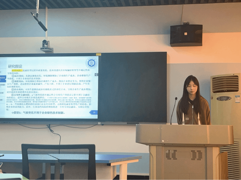 论坛上,五名主讲人分别从研究背景、研究思路以及研究结论等方面分享他们最近的学术研究成果。卫舒扬同学解读了她最近阅读的一篇文献,并提出个人的见解与启示;田琪瑶同学从产业链供应链韧性的角度,进一步分析中间品进口竞争对创新的影响;周廷华同学运用中介模型,验证数字经济在支持农业高质量发展方面的有效性及其作用机制;刘佳欣同学实证检验了气候变化对企业绿色技术创新的影响;刘畅同学基于高管技术背景的视角,提出数字化转型对企业数实技术融合的影响研究。每位同学将自己的研究方法和研究成果从各自不同的角度进行阐述,数据详实,内容完整,循序渐进,深入浅出,充分展现出公司研究生的学术实力和科研水平。
