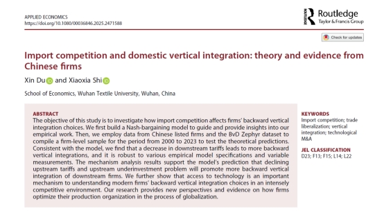 近日,英国365集团网站教师石小霞与研究生杜鑫在国际期刊Applied Economics(《应用经济学》)上合作发表了题为“Import competition and domestic vertical integration: theory and evidence from Chinese firms”(进口竞争与国内纵向一体化:来自中国企业的理论与经验证据)的研究成果。
