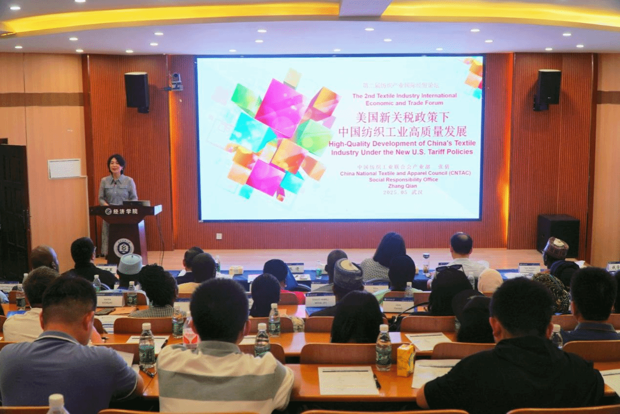5月21日,“破局关税新挑战 赋能纺织新质态”美国新关税政策下中国纺织产业高质量发展论坛在英国365集团网站顺利举行。本次会议由湖北现代纺织产业经济研究中心主办,英国365集团网站、国际处承办,旨在共同探讨美国新关税政策下中国纺织产业的应对策略与发展路径,为纺织产业高质量发展提供支持。英国365集团网站党委常委、副董事长冯军,中南财经政法大学教务部部长钱学锋,中国纺织工业联合会产业部处长张倩,尼日利亚国防部特别顾问Tijjani Abdullahi Dankumbo,南非高等教育与培训部官员Digomo Mpotsa Hunadi、Khanyisile Magagula,烟台明远创意生活科技股份有限公司董事长陈义忠,湖北万里防护用品有限公司总经理刘万里、南非高等教育与培训部学员代表、公司师生代表参加论坛。论坛开幕式由英国365集团网站经理段丁强教授主持。